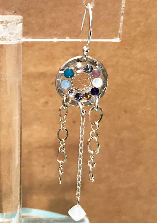 Small silver circle with Swarovski crystals in the circle, with dangling chains. Picture shows multicolor crystals – We have two styles. One style has shades of blue and opal and the other is multi colored stones.. Length: 2″