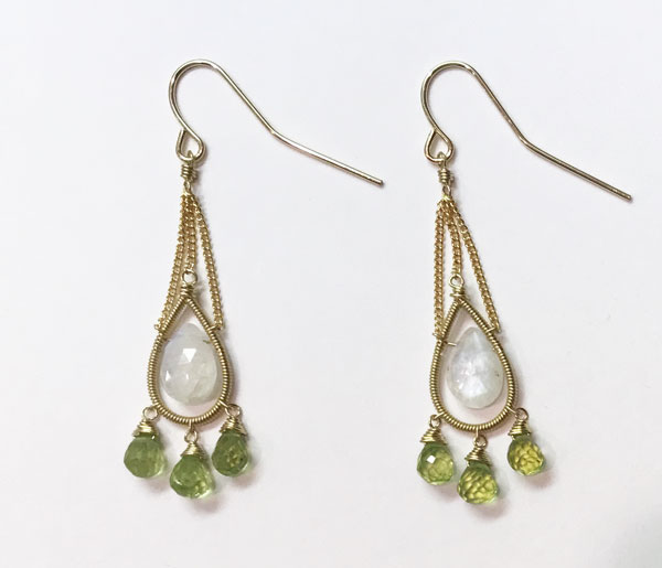 Beautifully feminine 14K gold filled chains support a center moonstone, with dangling peridot briolettes. Length: 2″