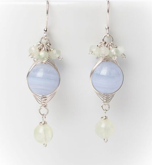 Prehinite and Blue Lace make up the soft stones of this Morning Dew Herringbone Dangle Earring. Length: 1 5/8″. It goes beautifully with any Morning Dew necklace in the collection.