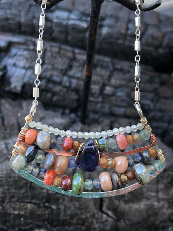 Mosaic fan of hammered sterling silver is woven with a deep blue iolite gemstone drop, embedded in smooth multi colored natural opal rondels, interspersed with micro faceted prehnite, luster citrine and more iolite gemstones. Woven on 14k gold filled with copper dividing line. This matches Earring ABAM-E78440.