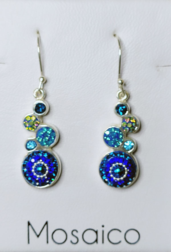 Shades of blue Austrian crystals in multi-size circles cascade into this fabulous drop earring. Sterling silver wires. Length: 1.75″