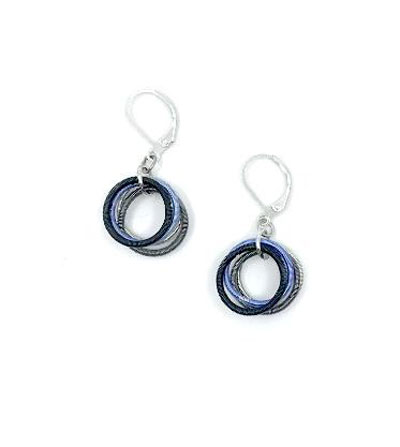 We have three different color waves of this multi color loop piano wire earring. Both earrings have the silver, bronze, black loops, but the difference is one has a blue loop and the 2nd pair has a red loop, and the third earring has a black hoop. Length: 1.25″. This is simple yet eye catching.