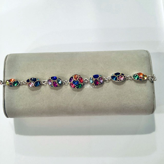 6.5-7″ multi-colored stone bracelet is enhanced with a center circle piece, and from there goes into different size ovals. There are 2 “o” rings to make this a 6.5″ or 7″ bracelet. All set in silver.