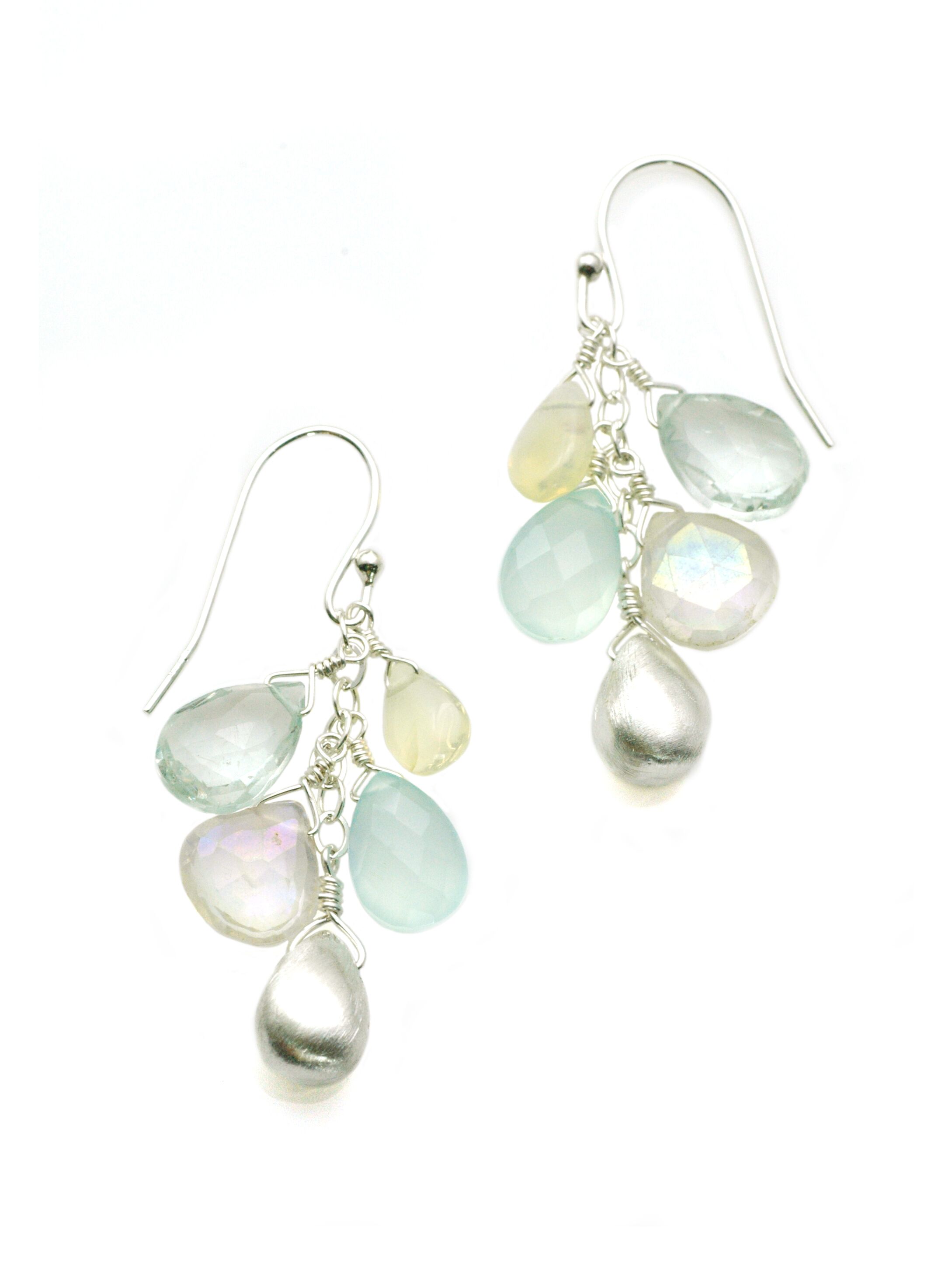 This multi gem cluster consists of opal, zircon, amethyst, and chalcedony with a brushed silver drop at the bottom. Length: 1.5″