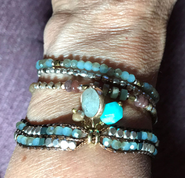 All the strands of turquoise and silver beads are attached with a magnetic clasp on this beautiful, casual bracelet by Nakamol Chicago. The little dangle of 3 stones sets it off perfectly. This jewelry is made by artisans in Thailand, who are able to earn a living thanks to Nakamol and her company. The jewelry looks far more expensive than it is, and is very stylish for any age.