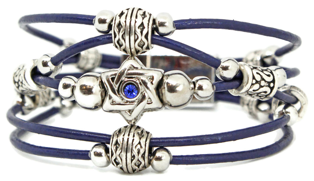 Welcome to My Tribe, Sea Ranch Jewelry’s line of Judaica for my “members of the tribe”! Show off your Jewish pride and heritage with this knockout beaded leather bracelet featuring choice of bead, including a stunning, chunky, 2-sided, Star of David center bead that includes blue Swarovski Elements crystals. The leather color is Royal Blue. The bracelet closure is a zamak magnetic clasp. Unless you specify otherwise, this is created as a bracelet size 6.75″