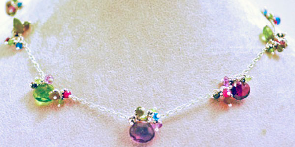 Gorgeous gemstones surrounded by tiny gemstone clusters are spread evenly along a sterling silver chain. 16″ in length