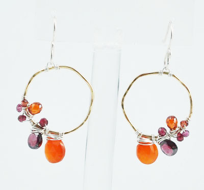 From the Lena Collection: Hoop wrapped with carnelian, red CA, rhodalite garnet, and garnet. Fold Filled hoop with silver wire.