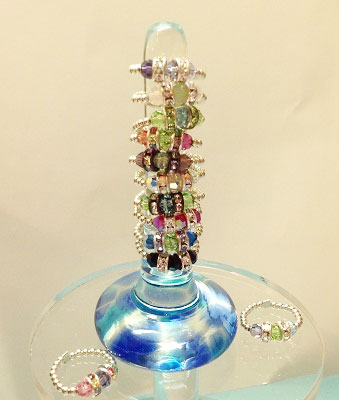 My rings are my specialty. The beads are laid out first for color, shaped, balance, and then manipulated to work together like a puzzle. Then the beads are strung on a length of 24 to 20 gage wire. The smallest bead hole determines the size of wire that I choose for my designs. Then I start wrapping the one wire around the mandrel placing each bead in its precise spot going a certain direction until each bead is placed. Then an eye-catching way of wrapping the ring together happens. Each one is unique and no two rings are exactly alike. I am able to duplicate rings in just about every size.