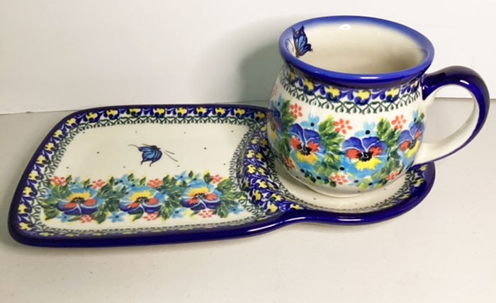 Collect these awesome coffee and cake sets and use them the next time you invite your friends for cards or anything social. This particular design is outstanding in it’s color, with the touch of the butterfly on the platter and just inside the cup. Add the small babka bowl and use in place of the mug, to make it a dip dish. 10.5x5x4.5″