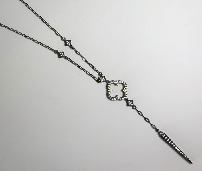 The black chain is 16″ with and extender. The beautiful clover shaped flower has pave stones in, and above and under it. The extended pave “stick” only adds to the simple design.