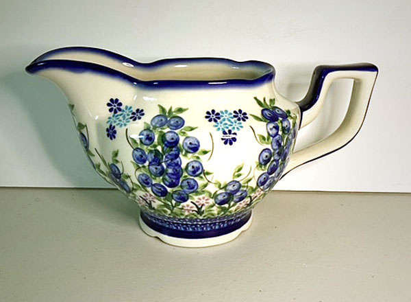 From the Kalich factory – Gravy Boat for your table – beautiful shape – exquisite patterns and glazing! 2 cup capacity, 8″ long from the tip to the end of the handle – 4″ tall.