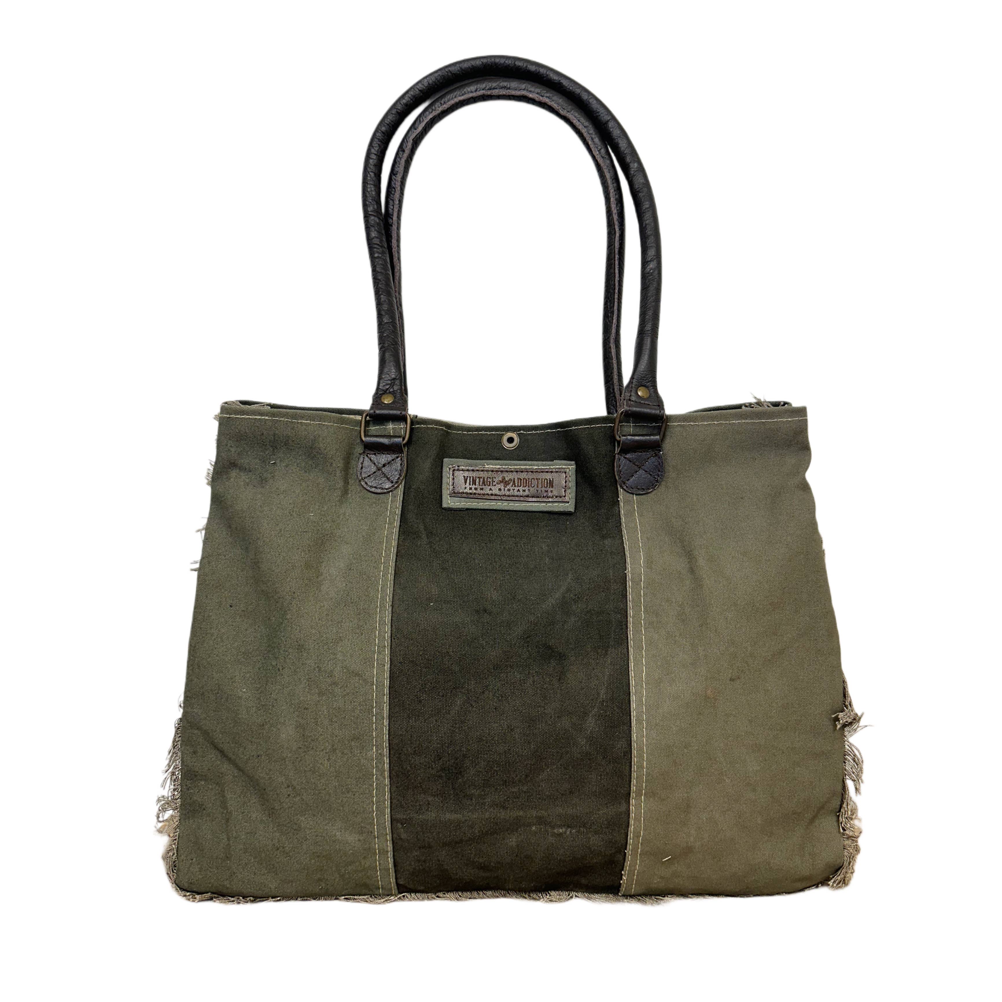 This hand selected eco-conscious handbag combines rugged durability with artisanal flair. Made from recycled military tents adorned with vintage embroidered beaded patchwork. The genuine leather handles offer a comfortable grip. The snap closures keep your essentials secure. Exterior pocket is perfect for easy access. Interior pocket. DISCLAIMER: Our recycled military tent bags are a tribute and reminder of the sacrifices and contributions of military veterans. These bags are made from authentic used military tents not brand new canvas packaged as recycled tents or tarps. THEY ARE THE REAL DEAL! The tent material shows signs of worn-like imperfections which add to its character. Each bag has differences in stains and colors. Your bag is as unique as each soldier’s experience seeking shelter in these tents whether in the training field or in a combat zone. Vintage fabrics are not repaired and have distinctive characteristics of worn threads, sequins or beadwork. You will receive this photographed bag. All Sales Final