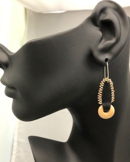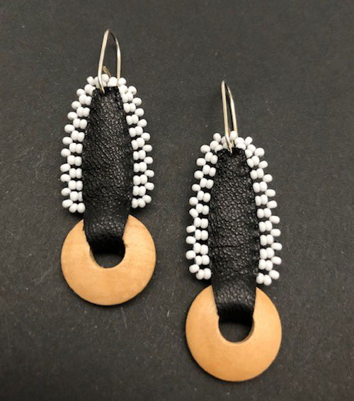These beautiful leather and seed bead earrings have an organic feel to them, utilizing black leather, colored seed beads, and light wooden circles. We have 5 colors for this earring. The leather is recycled, and the beads are hand-sewn.