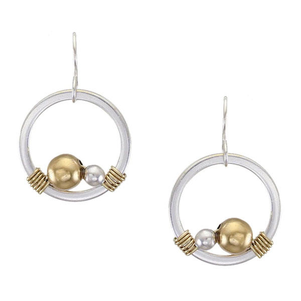 A silver ring with two brass and silver beads and wire wrapping at the bottom.
