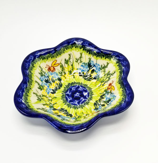 A little Tchotchke dish that could hold anything from rings to peanuts. Size: 5x5x1″ The beautiful scalloped edge adds to the design. Size: 5x5x1″.