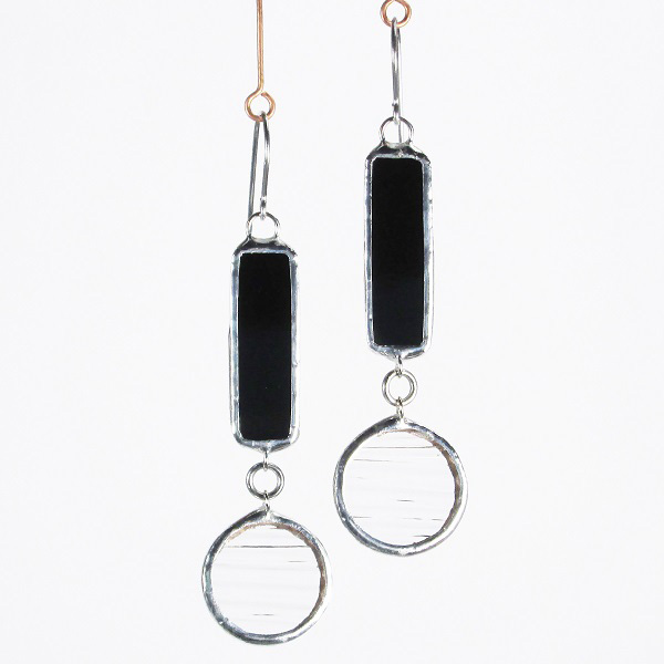 This silver 2-piece rectangle and disc earring is perfect for those days when you just need something to go with your basic black outfit. Don’t save this for dressy – looks great with jeans, too. It has 2 types of glass – black opaque and clear corrugated.