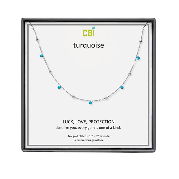 Turquoise and Silver – an awesome combination of semi-precious stones and silver balls on a 16″ fine silver plated chain with a 2″ extender.