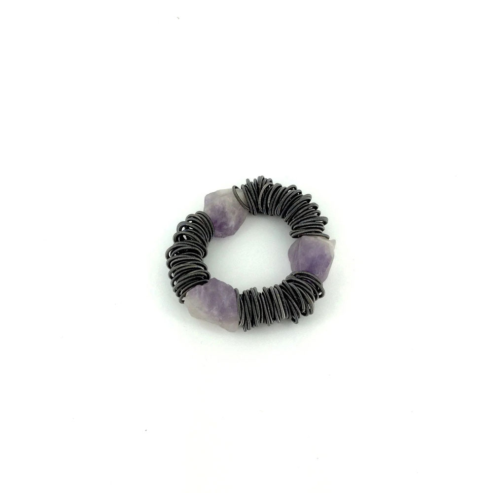 Chunks of real amethyst are interspersed between lots of slate spring rings. Bracelet is stretchable and will fit most wrists.