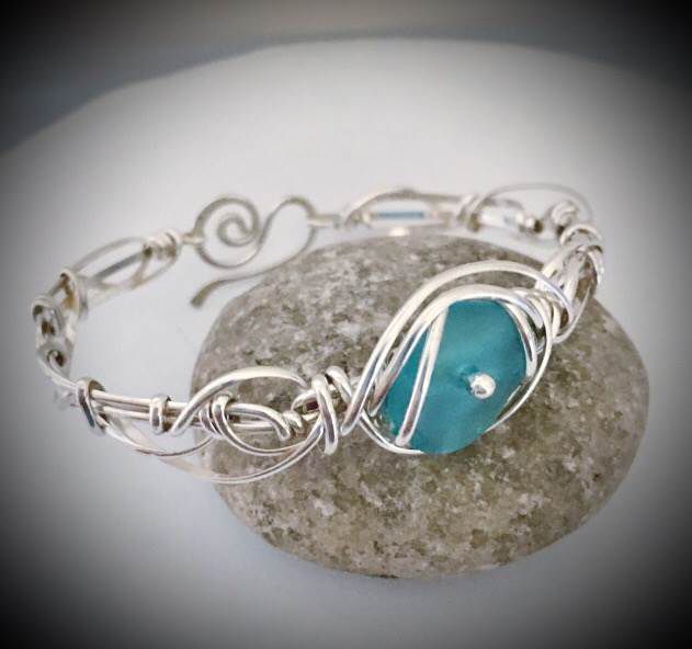ONE of a KIND Cuff Bracelets ~ (Argentium) Sterling Silver cuffs ~ woven with Argentium Silver ~ wraps up and around natural pieces of seaglass. These are unique & fabulous … each is held tight with a spiral clasp, which mimics ”the motion of the ocean”. The picture tells the story here ~ available in a variety of seaglass colors and are simply wonderful. Shown in Green – We have Seafood, which is a pale green.