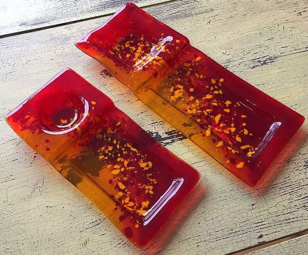 Shown is a 6×12 inch Large Multi Purpose in red pebble. On the left is a 5×12 inch Small Multi Purpose also in red. We have this red-orange combination in the small dish only. This dish is perfect for dips and chips, crackers, strawberries – anything you can imagine. Dishwasher safe. Add the matching Spoon/Knife set to complete the serving experience. Specify set on right or left when buying the combination.