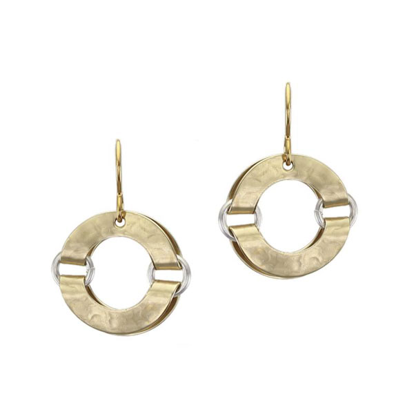 Two folded and hinged oval rings in brass and silver. Wire earring.