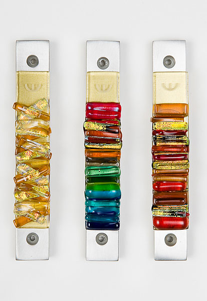 This mezuzah is crafted with a silver pewter metal casing, and decorated with fused glass, dichroic glass, and colored glass, with a distinctive texture. Shin engraved. We have #1(Golden Sun) and #2 (Rainbow) in stock. Parchment included. Nails are. 5 x3/4 x3/8″