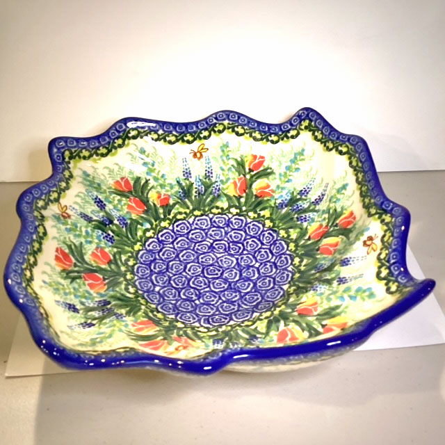 This is a very unique shaped bowl, it is wide and shallow with a intricate swirled shape.