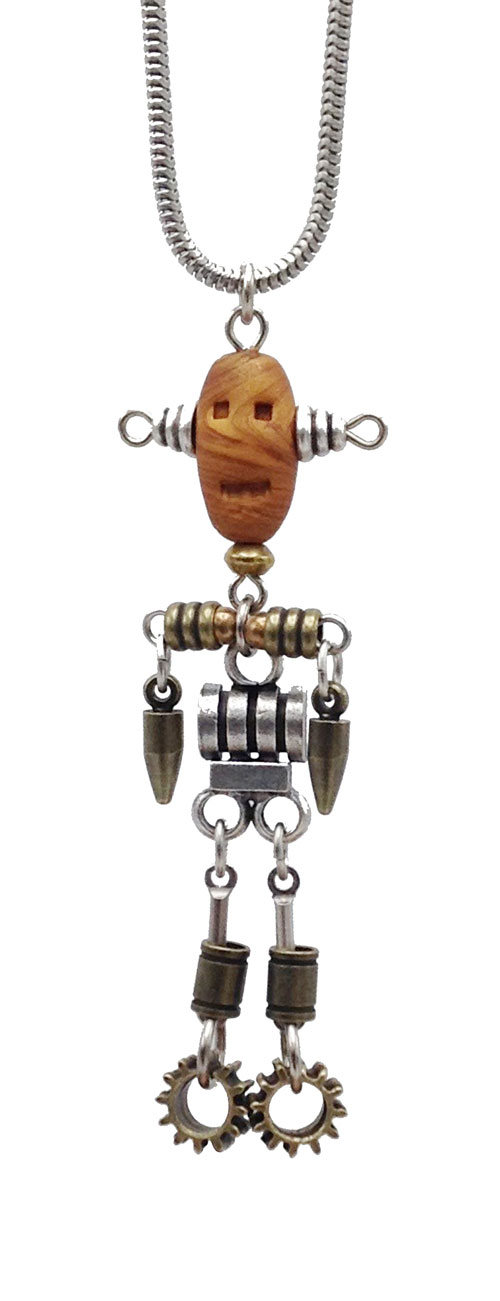 Pieces are created with castings taken from industrial artifacts of the machine age, incorporating items such as gears, levers, antique keys, 45rpm record inserts, and other found objects. She draws her inspiration from the urban environment, the remnants of the machine age, and monumental forms that convey a feeling of strength and simplicity. All ALCHEMY merchandise is comprised of pewter castings made from reclaimed metals, brass based chains and findings plated with finishes in antique silver, antique brass, and antique copper. Chain 16″ with 3″ extension