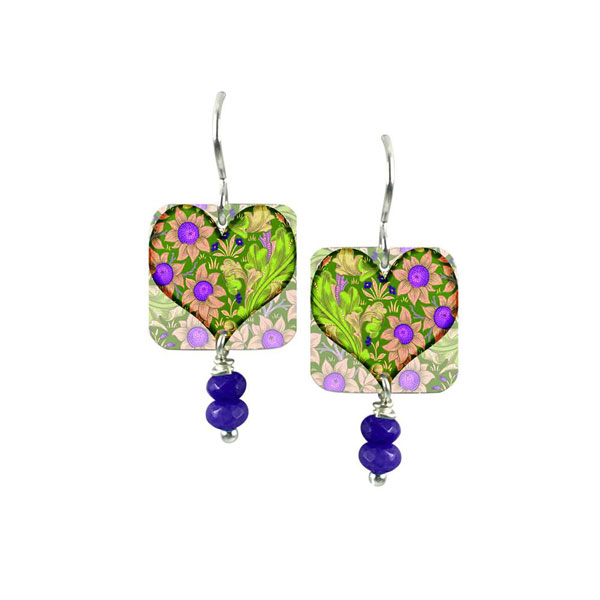 Lightweight high definition color-infused metal jewelry. Scratch resistant and waterproof aluminum earrings. Sterling Silver filled earring wires. Faceted dyed jade beads. 1 1/8” total length. Delivered on a lipped earring card. Artist Bio and Care card included.