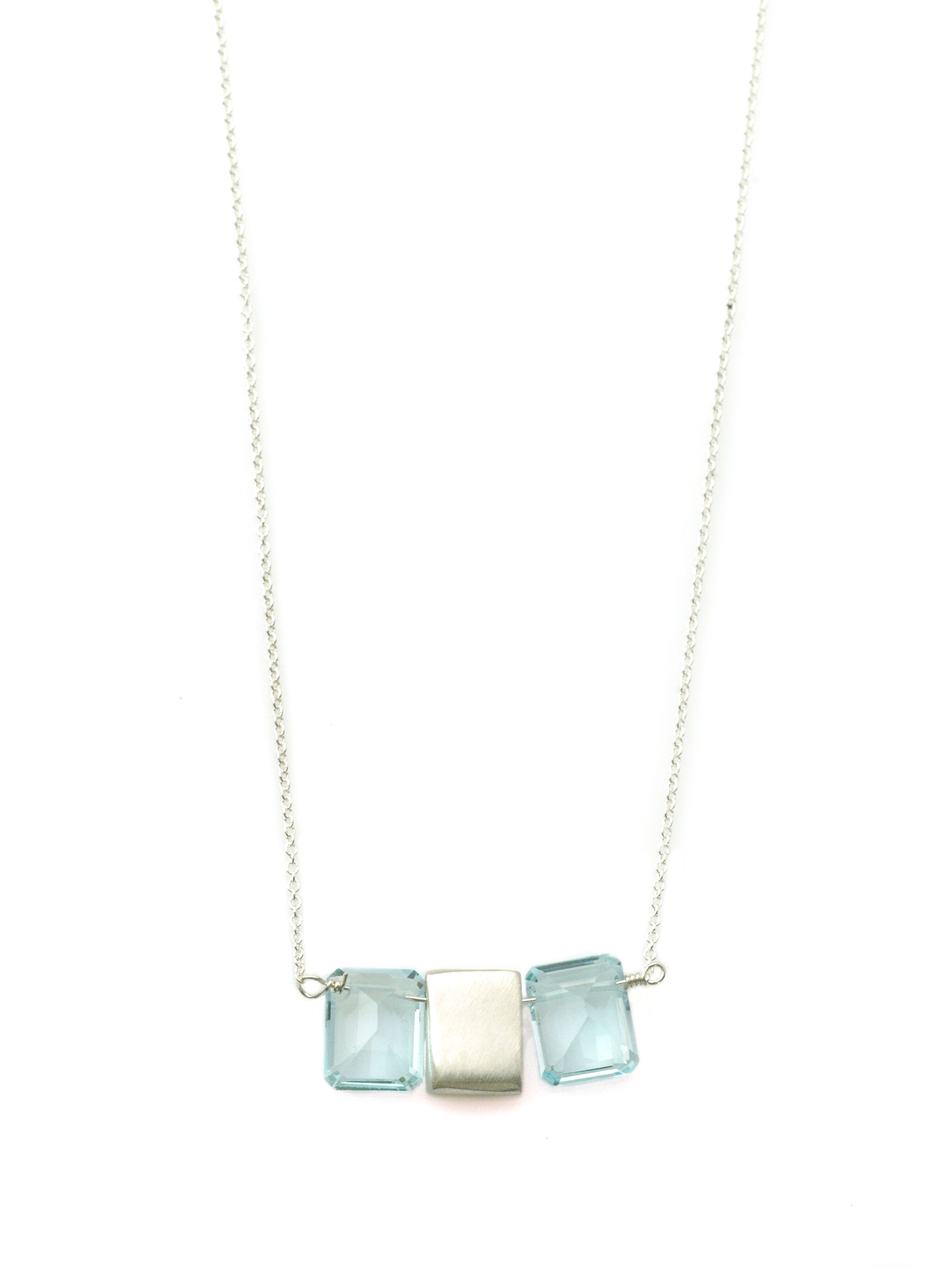 The two blue topaz stones encased an identical rectangle of brushed silver suspended on a silver chain.