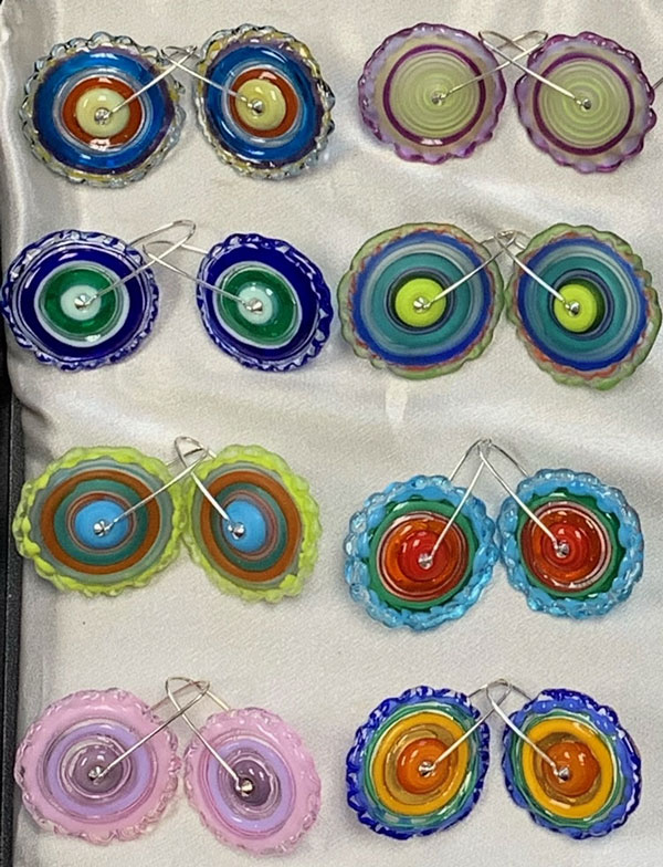 We have 8 pairs of these gorgeous glass trapeze earrings. Many have several colors in them, making them adaptable to any outfit. This is what the artist, Beth Williams, has to say about her work: “Exploring the qualities of glass and color are what drive my work; using light and transparency in surprising ways along with layering color on color helps me to create unusual contemporary beads and jewelry. Inspiration comes from my gardens, the ever-changing light on the ocean, the seascapes that surround me…anywhere colors collide in nature. Pure silver and gold accents add a final tactile quality, allowing my pieces to be as interesting to touch and view as they are to wear.”