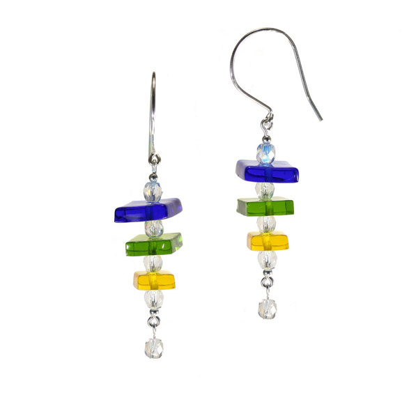 We have 2 color versions of the triple Square fused glass earring. The sizes of the squares are graduated from large to small, with a Swarovski crystal dangling at the bottom. The wire is is sterling silver filled.
