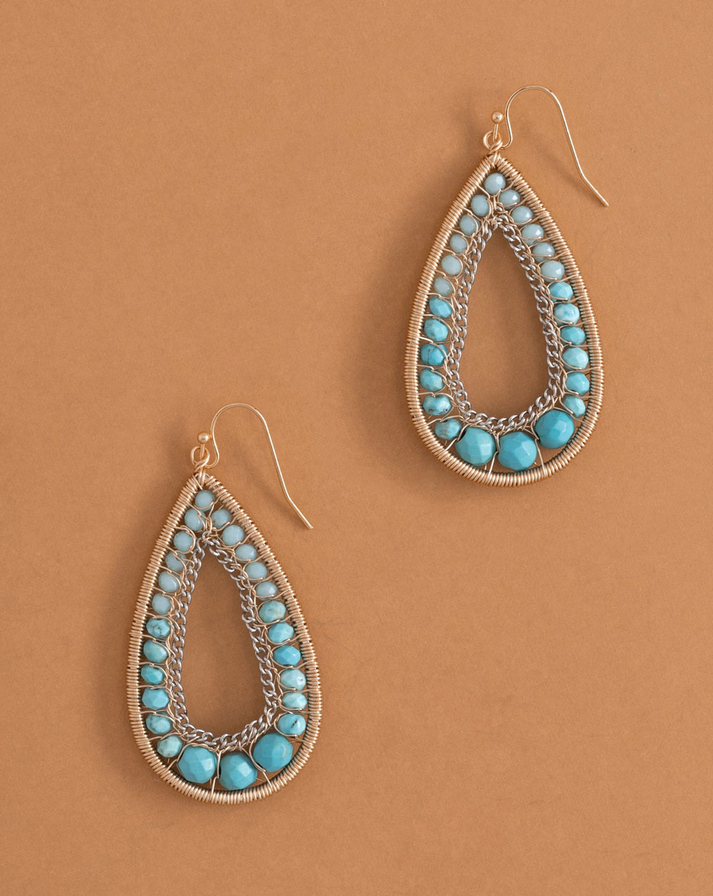 Gorgeous multi-size turquoise stones encased in a teardrop gold wire-wrapped frame. Measurements: 2.25″x 1.25″