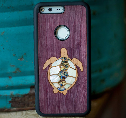 Did you know our Turtle inlay is comprised of two different wood species and two different types of seashell? This 6000mAh power bank holds an extra 6 hours of power when fully charged. It comes with a USB cord and soft carrying case that fits easily in your pocket or purse. The picture shows it as a cell phone but the image is identical on the power bank. Use this for your cell phone or tablet when you are on the move or just when your phone is about to die. Size: 4.75″x2.75″x.5″. Below is an example of how it works.