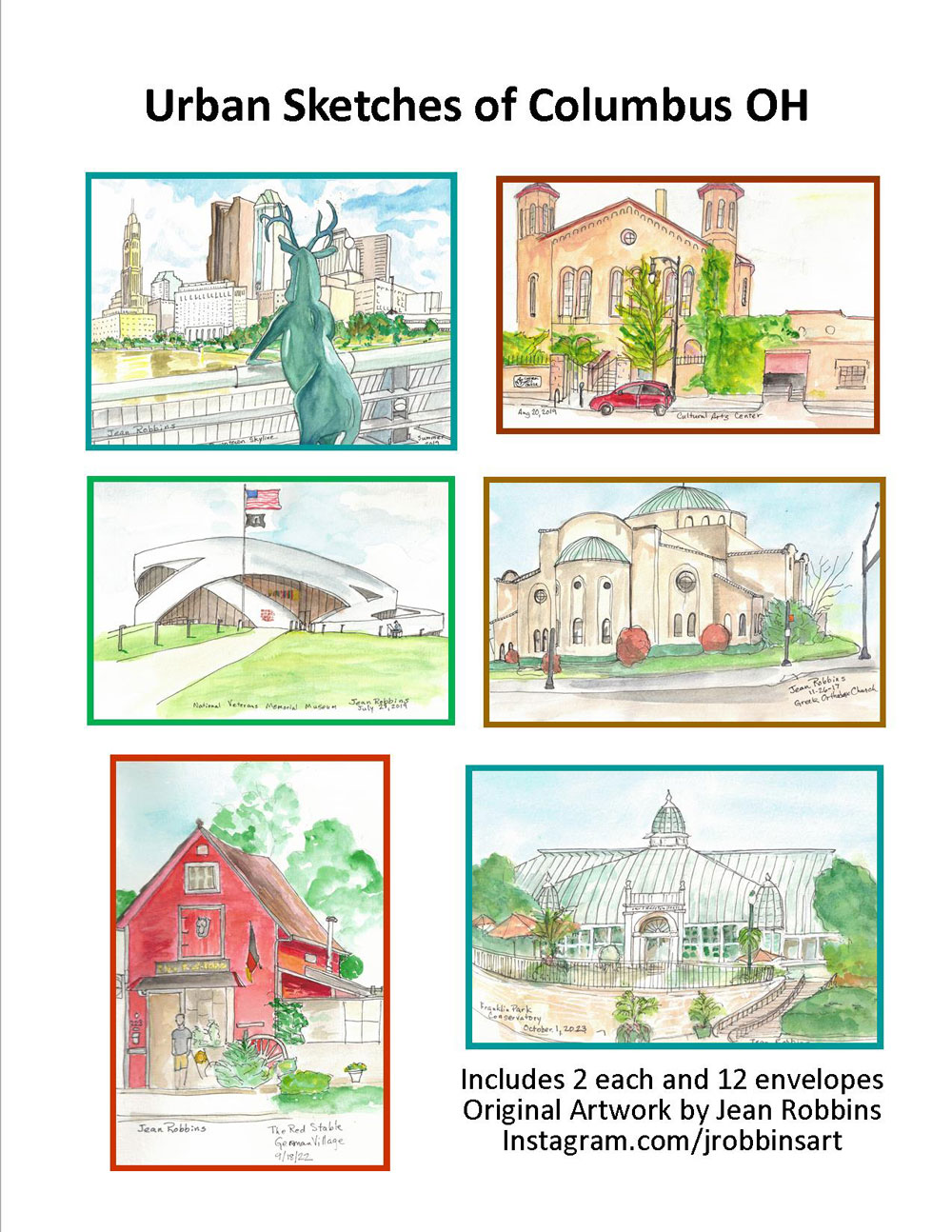 Jean, a resident of Bexley, OH, has highlighted her masterful art and painting to the familiar landmarks of Columbus, OH in notecard form. There are 6 places, such as Veterans Memorial and the Conservatory, with 2 cards of each design in the package. Any Columbus native will recognize the landmarks immediately. A wonderful gift to give to family and friends.
