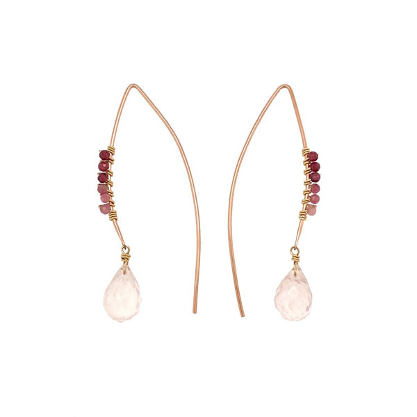 Unique “V” shape single piece earring with small gemstones wrapped on the front and a rose quartz drop.