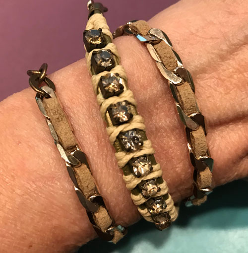 Looks like you are wearing 3 bracelets, but it’s one LONG strand that can be twisted around your wrist 3 times, with the crystals in the middle OR you can wear it as a necklace. This is by Israeli artist, LaHola. The gold is gold plate.