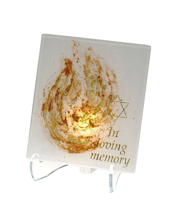 The Eternal Flame is created with copper and bronze micas encapsulated between layers of fused glass. This electric Yahrzeit (Memorial Candle) plaque has the words ”In Loving Memory” and a Star of David in gold. It comes complete on an acrylic stand, with electrical fitting, 6′ cord with inline switch and the low wattage light bulb.